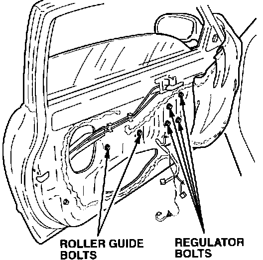 7. Lower the window approximately half way. Loosen the four window regulator bolts; then, loosen the two roller guide bolts about two turns.