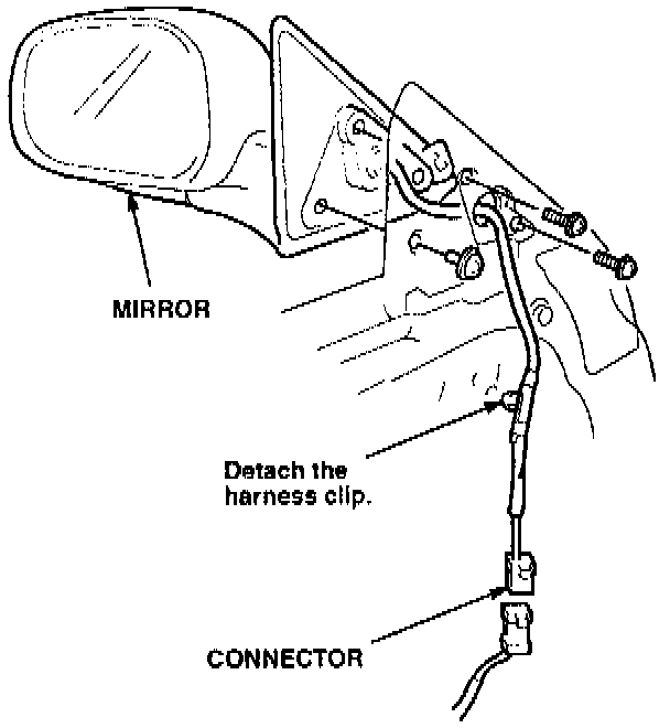4. Disconnect the harness clip from the inner door panel. Remove the mounting screws, and remove the mirror.