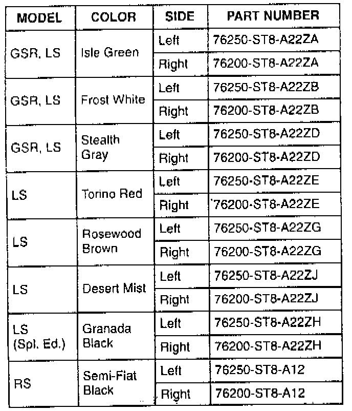 Failed P/N: Use the P/N of the new mirror, with the last number changed from a 2 to a 1. For example, if the new mirror's P/N is 76250-STB-A22ZE, the failed P/N is 76250-ST8-A21ZE.