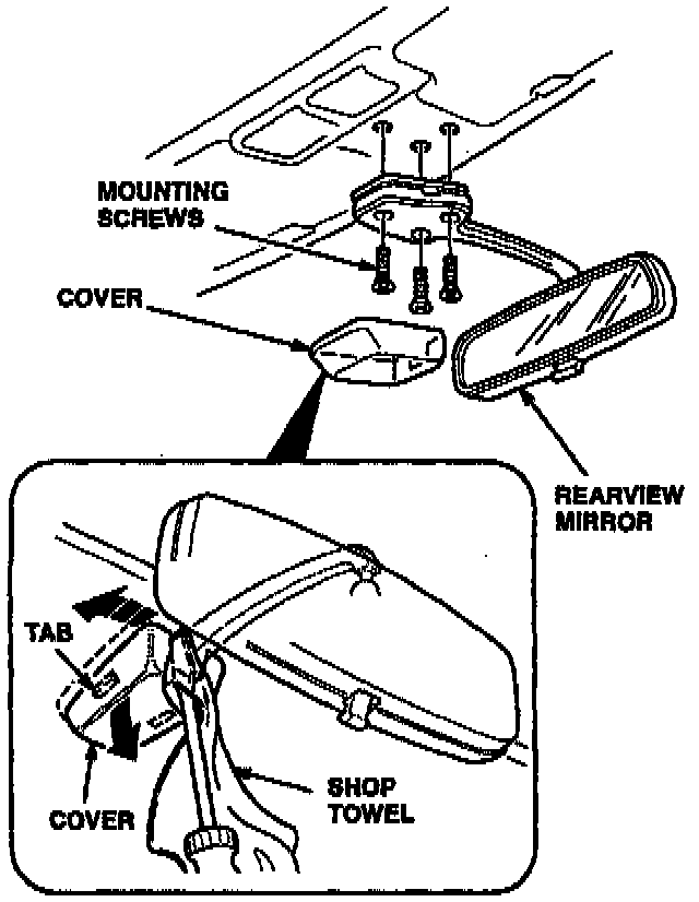 1. Remove the rearview mirror by carefully prying off the cover and removing its three mounting screws.