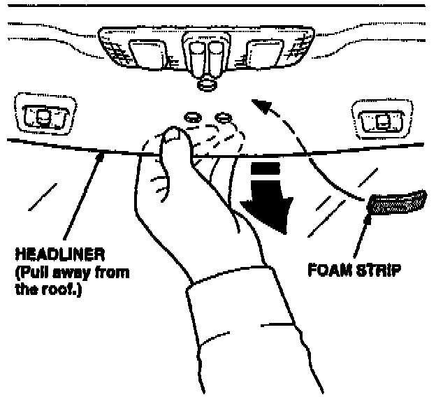 3. Use your fingers to pull the headliner away from the roof at the rearview mirror mounting area. Move the headliner just enough to allow installation of the foam strip.