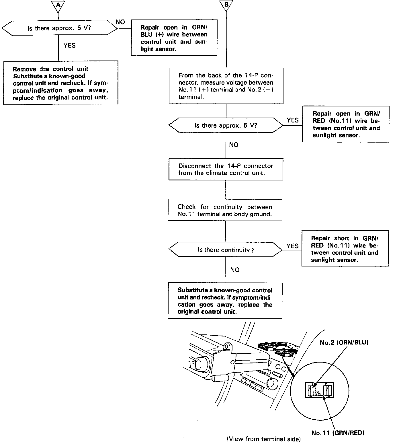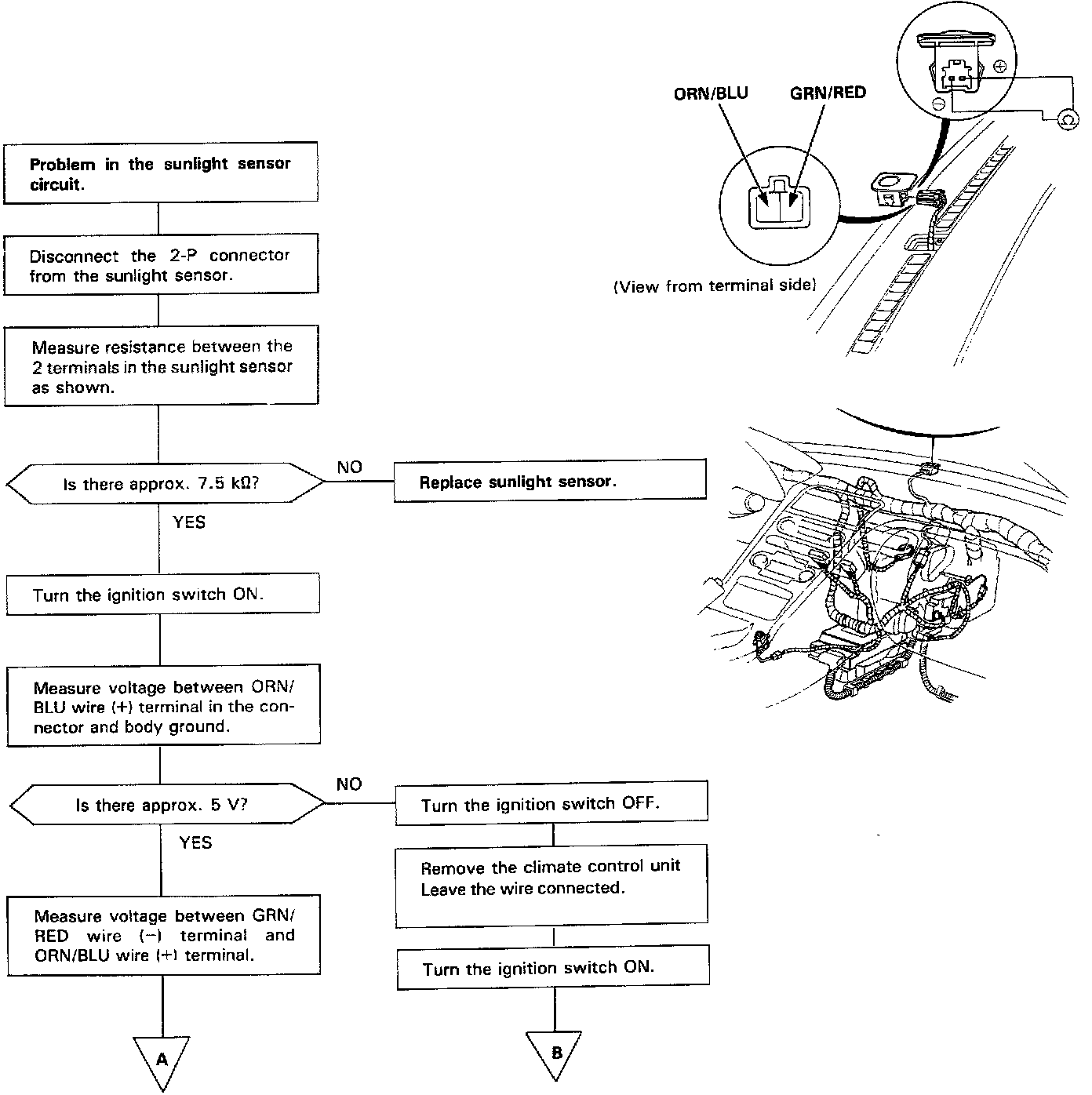 Sunlight SensorSelf-diagnosis indicator light C comes on: Indicates a problem in the sunlight sensor circuit. Use a digital multimeter (KS-AHM-32-003) to check it.