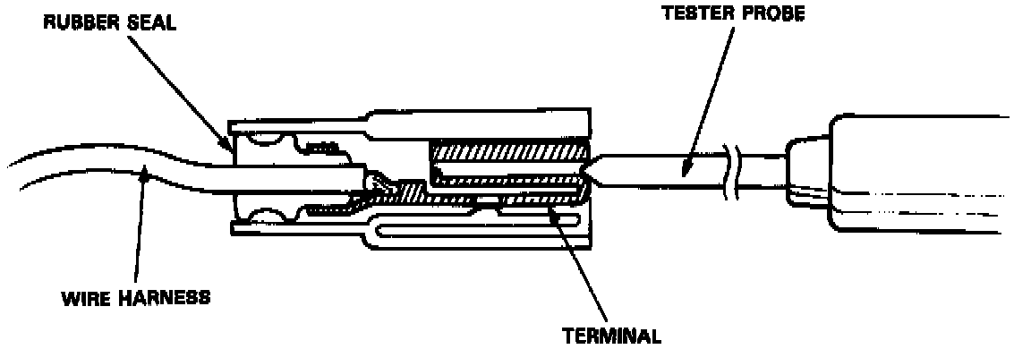 For testing at connectors other than the test harness, bring the tester probe into contact with the terminal from the connector side of wire harness connectors in the engine compartment. For female connectors, just touch lightly with the tester probe and do not insert the probe.