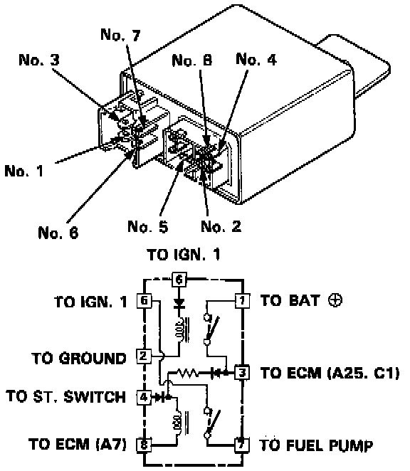 2. Attach the battery positive terminal to the No. 4 terminal and the battery negative terminal to the No. 8 terminal of the PGM-FI main relay. Then check for continuity between the No. 5 terminal and No. 7 terminal of the PGM-FI main relay.