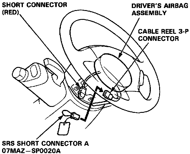 4. Install SRS short connector A (O7MAZ-SPOO2OA) to the cable reel side of the 3-P connector.