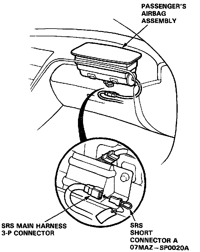 7. Install SRS short connector A (O7MAZ-SPOO2OA) to the SRS main harness side of the 3-P connector.