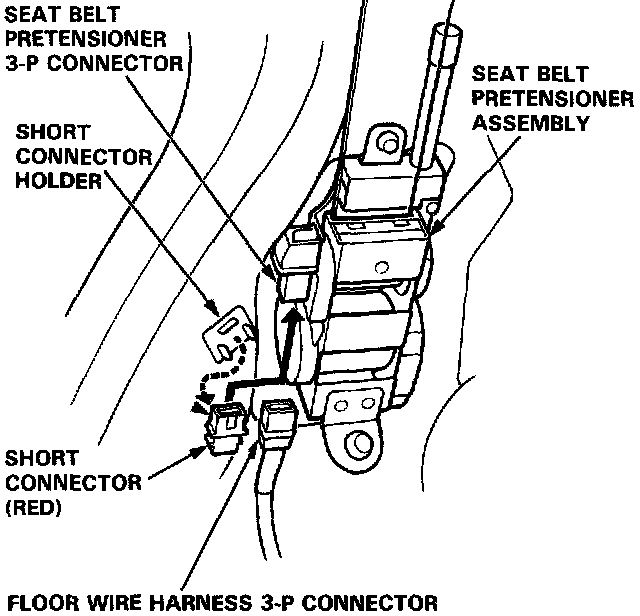 10. Disconnect the seat belt pretensioner 3-P connector, then install the short connector (RED) to the pretensioner side of the connector.