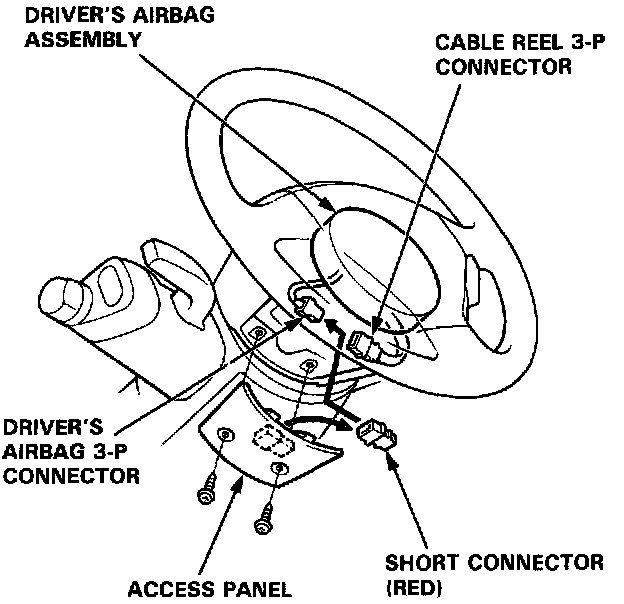 2. Remove the access panel from the steering wheel, then remove the short connector (RED) from the panel.