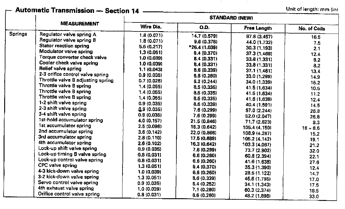 SP7A 4-spd A/T, Transmission Spring Measurements: