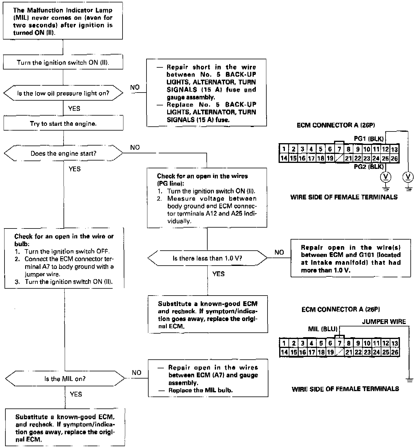 - If this symptom is intermittent, check for a loose No. 5 BACK-UP LIGHTS, ALTERNATOR, TURN SIGNALS (15A) fuse in the under-dash fuse/relay box, a poor connection at ECM terminal A7, or an intermittent open in the BLU wire between the ECM (Engine Control Module) (A7) and the gauge assembly.