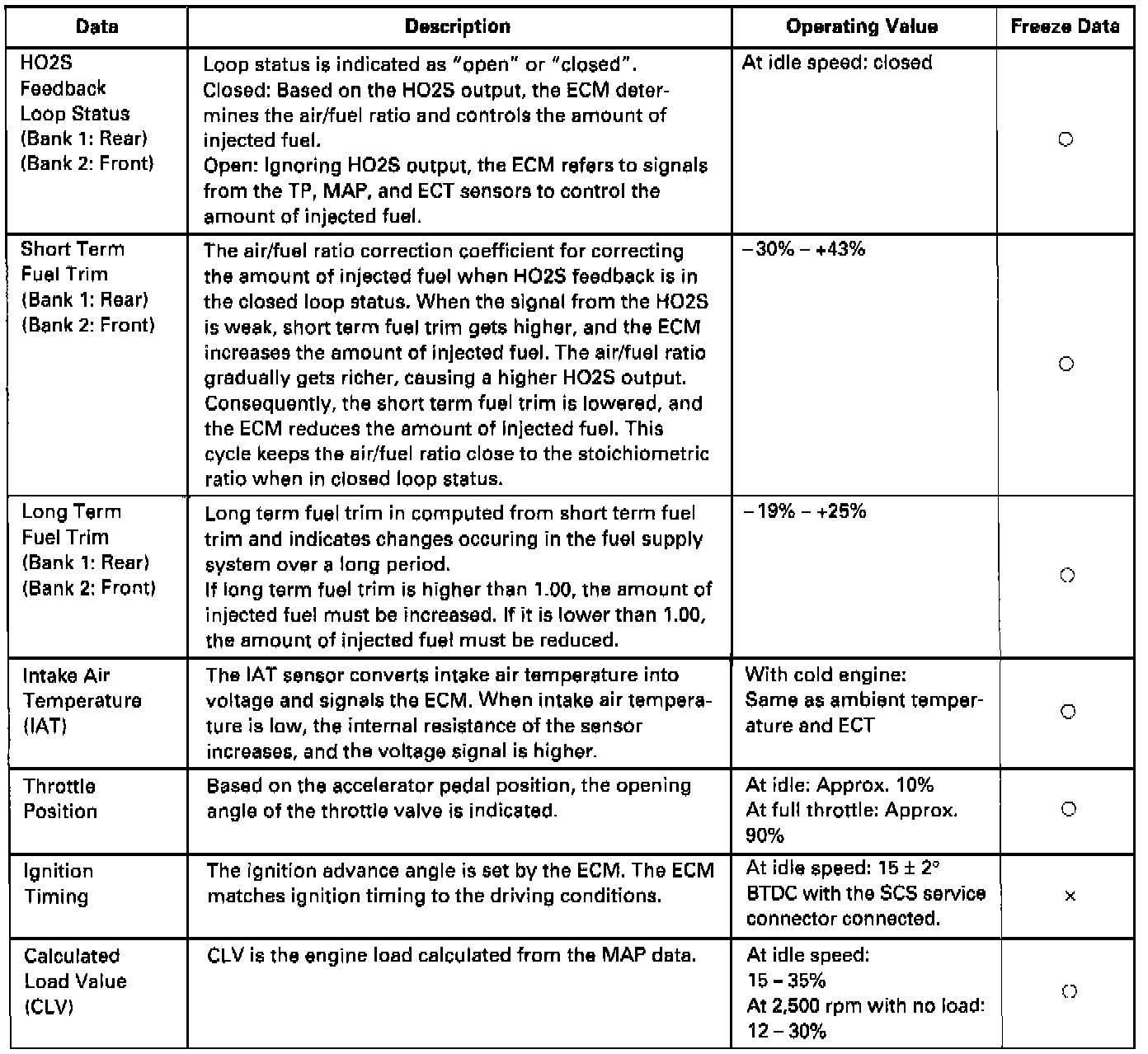 - The "operating values" given below are approximate values and may be different depending on the environment and the individual car.