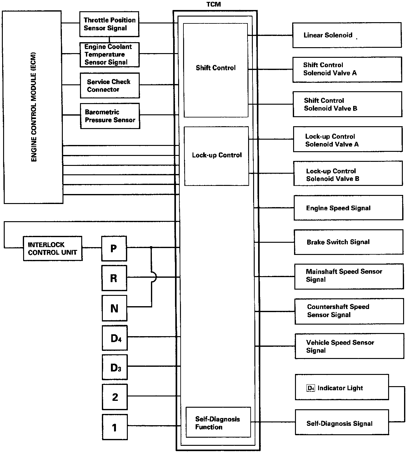 The electronic control system consists of the Transmission Control Module (TCM), sensors, a linear solenoid, and four solenoid valves.