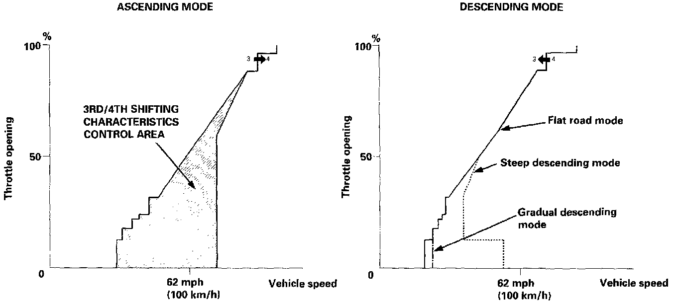 When the TCM determines that the vehicle is going down a hill in [D4] position, the shift-up speed from 3rd to 4th gear when the throttle is closed becomes faster than the set speed for flat road driving to widen the 3rd gear driving area. This, in combination with engine braking from the deceleration lock-up, achieves smooth driving when the vehicle is descending.