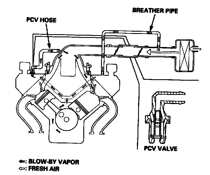 The Positive Crankcase Ventilation (PCV) system is designed to prevent blow-by gas from escaping to the atmosphere. The PCV valve contains a spring-loaded plunger. When the engine starts, the plunger in the PCV valve is lifted in proportion to intake manifold vacuum and the blow-by gas is drawn directly into the intake manifold.