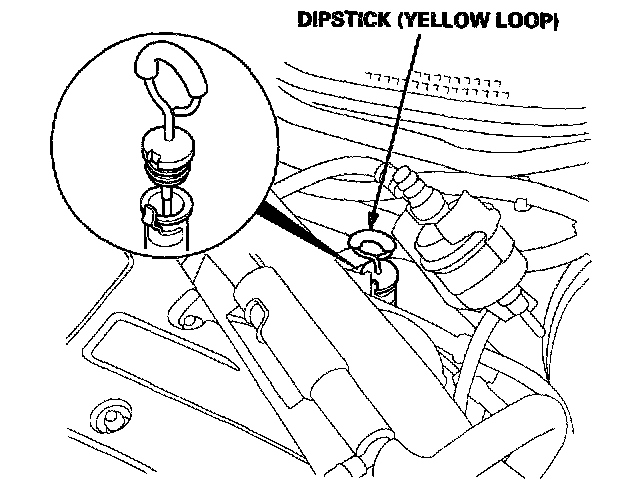 2. Remove the dipstick (yellow loop) from the transmission, and wipe it with a clean cloth.
