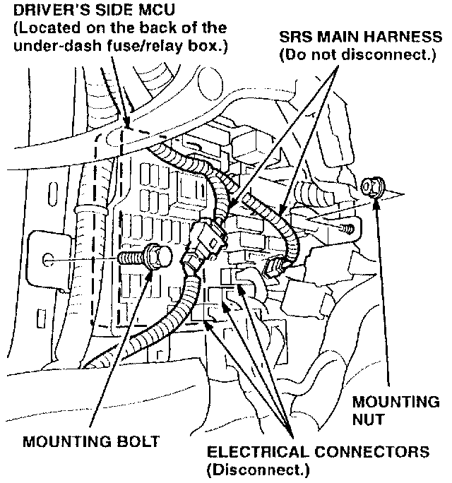 5. Disconnect all the electrical connectors from the under-dash fuse/relay box except the SRS main harness connector (the double-locked, yellow harness connector).