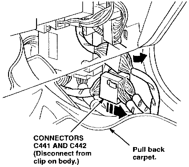 19. To gain better access to the MCU, pull connectors C441 and C442 toward the rear of the car so they come loose from their body mount. Move the harness out of the way.
