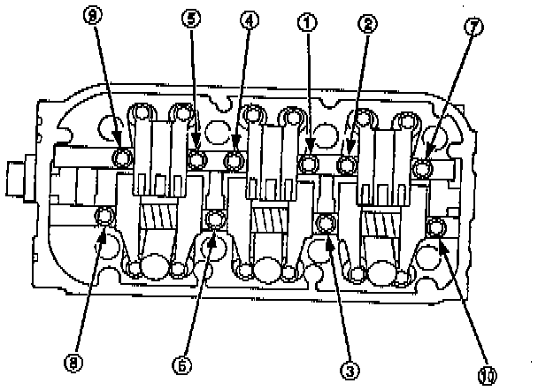 Tighten each 8 x 1.25 mm bolt two turns at a time in the sequence shown in image to ensure that the rockers do not bind on the valves. Repeat sequence until 24 Nm (17 ft. lbs.) is reached.
