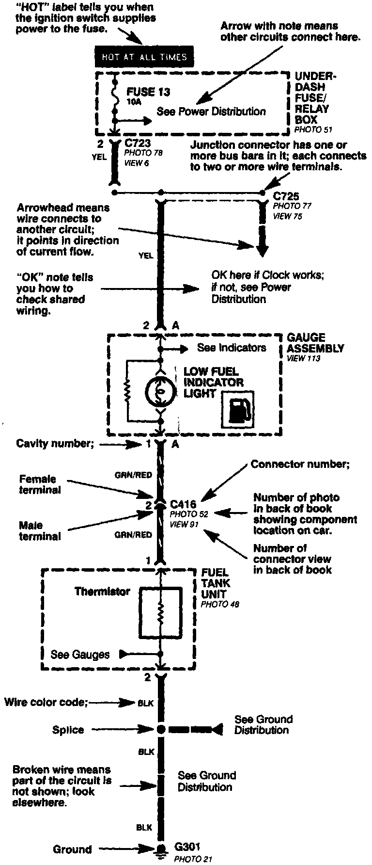 All in-line, pigtail, and fuse box connectors are numbered (C725, C416 etc). Component connectors are not numbered but are identified by the name of the component. If a component has more than one connector, each connector is assigned a letter (A, B, C etc). Below most connector numbers and component names are PHOTO and VIEW numbers. The PHOTO number refers to a photo in the back of the book that shows the connector's location on the car. The VIEW number refers to an illustration in the back of the book that shows the connector face, wire colors, connector cavity numbers, and other details. The connector cavity numbering sequence begins at the top left corner of the connector as seen from either of the viewpoints. Disregard any numbers molded into the connector housing.