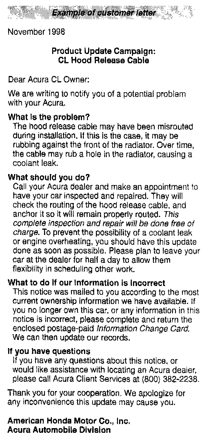 No letter - If a customer brings in a 1997 CL for service and does not have a letter, verify that the vehicle is eligible for this campaign.