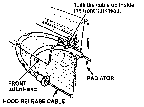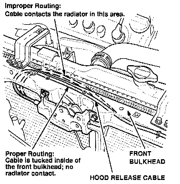 Inspect the routing of the hood release cable, and anchor the cable with a cable tie. If necessary, paint the radiator to protect it.