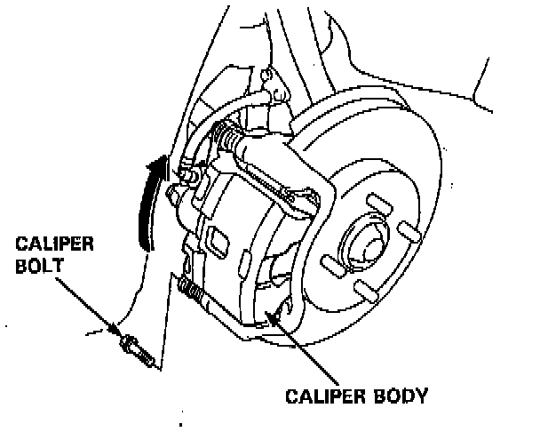 2. Remove the caliper bolt, and pivot the caliper up out of the way. Check the hoses and pin boots for damage and deterioration.