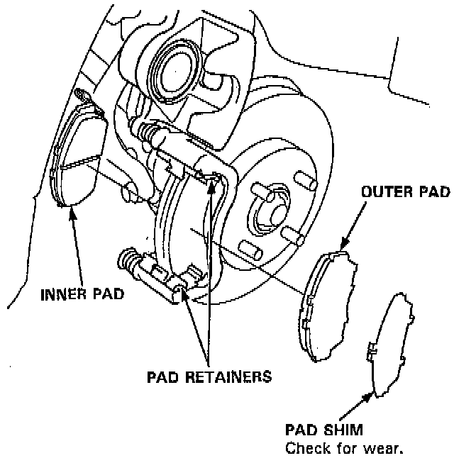 6. Install the brake pads and pad shims correctly. Install the pad with the wear indicator on the inside.
