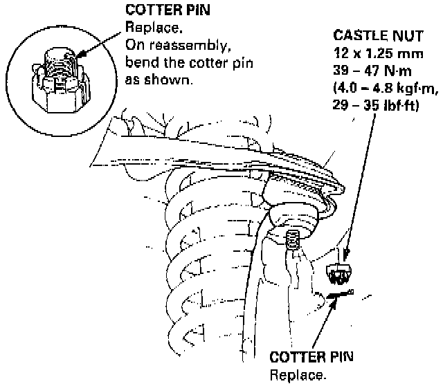- Torque the castle nut to the lower torque specification, then tighten it only far enough to align the slot with the pin hole. Do not align the nut by loosening.