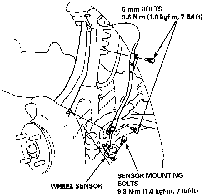 5. Install the sensor wire with the two 6 mm bolts (for cars with ABS).
