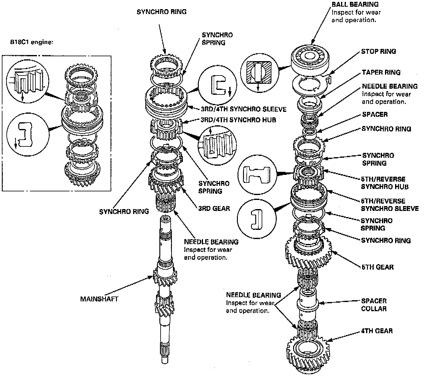 Prior to reassembling, clean all the parts in solvent, dry them and apply lubricant to any contact surfaces. The 3rd/4th and the 5th synchro hubs, however, should be installed with a press before lubricating them.