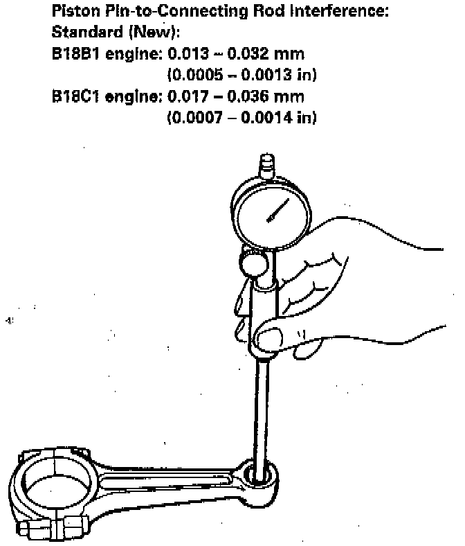 3. Measure the piston pin-to-piston clearance. If the piston pin clearance is greater than 0.022 mm (0.0009 inch), remeasure using an oversize piston pin.