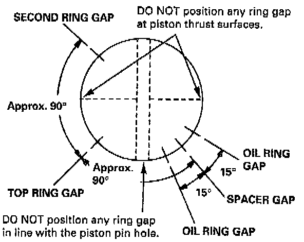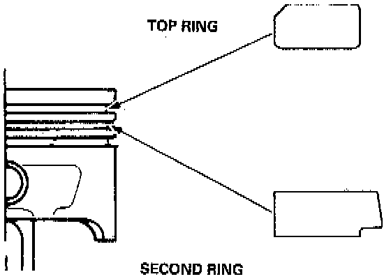 1. Install the rings as shown. Identify top and second rings by the chamfer on the edge. Make sure they are in their proper grooves on the piston.