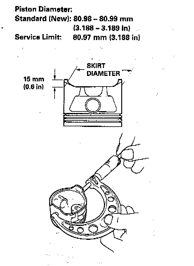 2. Measure the piston diameter at a point 15 mm (0.6 inch) from the bottom of the skirt.