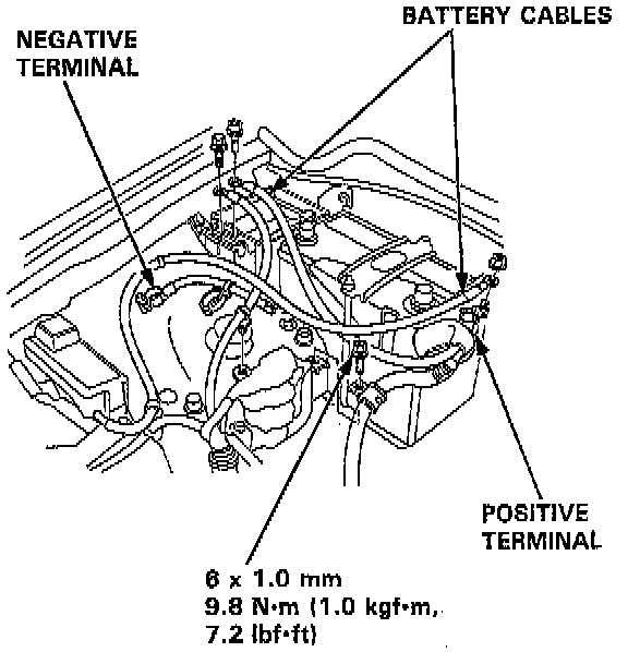 4. Disconnect the battery cables from the under-hood fuse/relay box and under-hood ABS fuse/relay box.
