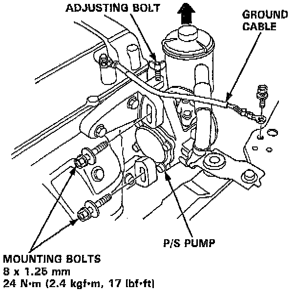 15. Remove the adjusting bolt and mounting bolts, then remove the Power Steering (P/S) pump belt and pump.