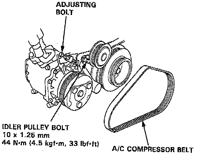 16. Loosen the idler pulley bolt and adjusting bolt, then remove the Air Conditioning (A/C) compressor belt.