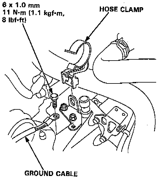 18. Remove the transmission ground cable and hose clamp.