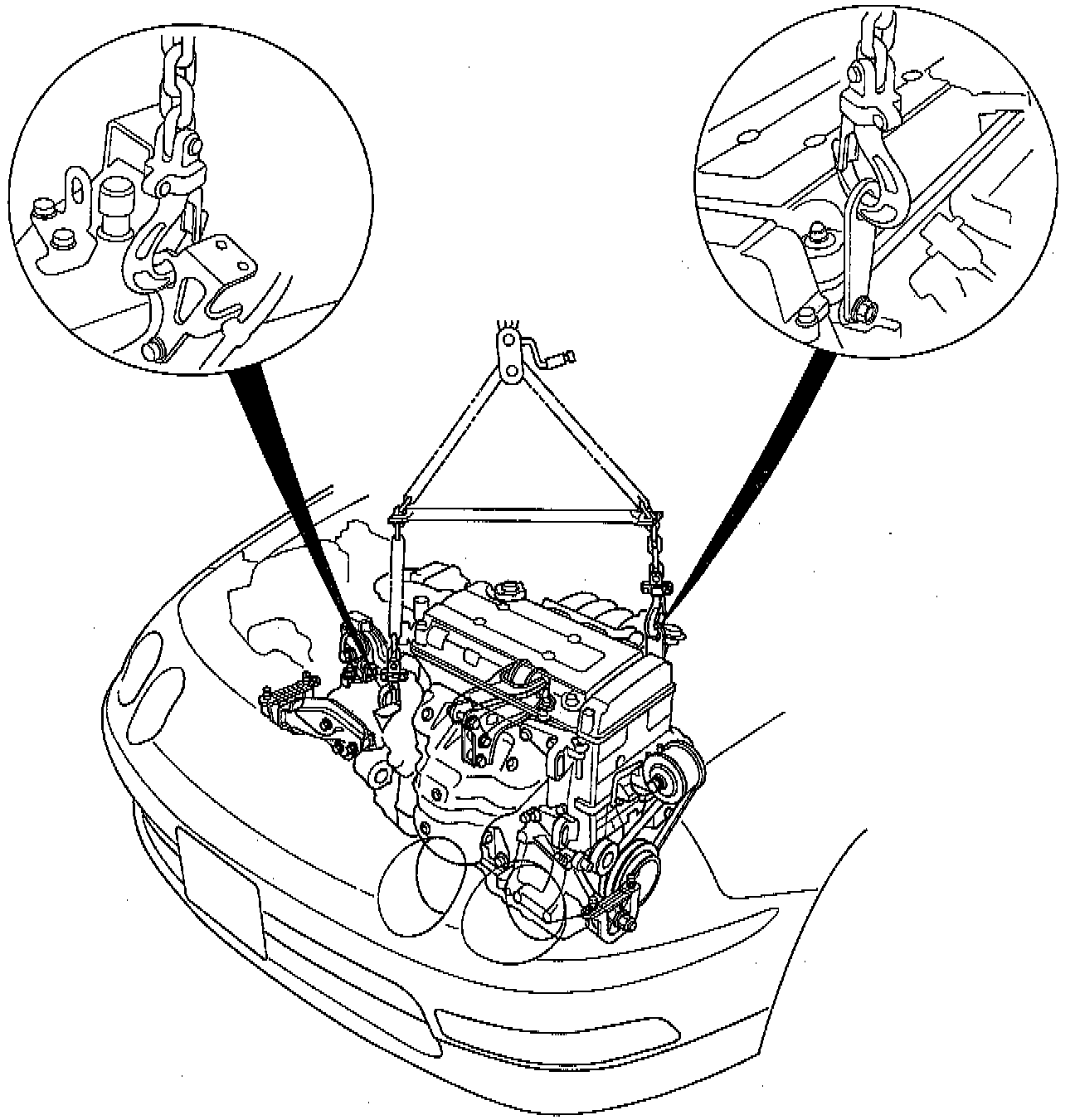 WARNING:- Make sure jacks and safety stands are placed properly and hoist brackets are attached to the correct positions on the engine.