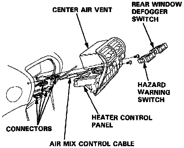 1. Disconnect the air mix control cable from the heater unit.2. Remove the rear window defogger switch and the hazard warning switch.