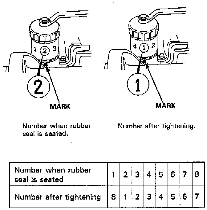 b. Tighten the filter by turning it clockwise seven numbers from the marked point. For example, if a mark is made under the number 2 when the rubber seal is seated, the filter should be tightened until the number 1 comes up to the marked point.
