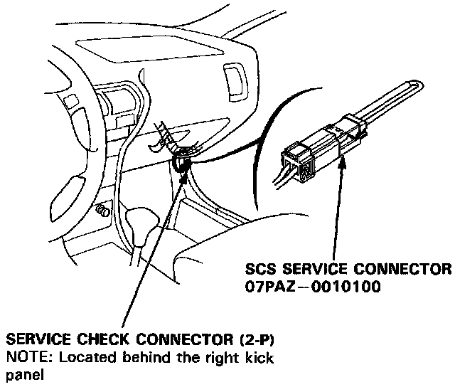 2. Pull out the service check connector located behind the right kick panel. Connect the service check connector with the special tool.