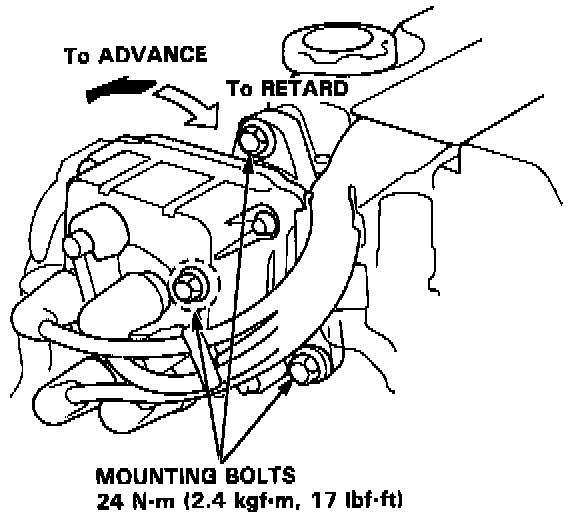 5. To adjust ignition timing, loosen the distributor mounting bolts, and turn the distributor ignition (DI) housing counterclockwise to advance the timing or clockwise to retard the timing.