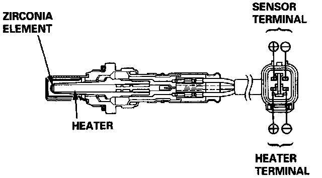 The Heated Oxygen Sensor (HO2S) detects the oxygen content in the exhaust gas and signals the ECM. In operation, the ECM receives the signals from the sensor and varies the duration during which fuel is injected. To stabilize the sensor's output, the sensor has an internal heater and the sensor element is coated with a catalyst. The HO2S is installed in TWC housing.