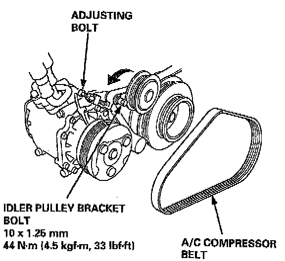 3. Loosen the adjusting bolt and idler pulley bracket bolt, then remove the A/C compressor belt.
