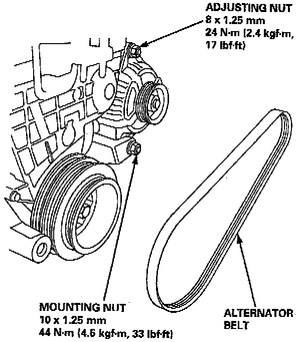 4. Loosen the adjusting nut and mounting nut, then remove the alternator belt.