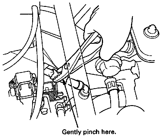 2. At idle, make sure there is a clicking sound from the PCV valve when the hose between PCV valve and intake manifold in lightly pinched with your fingers or pliers.
