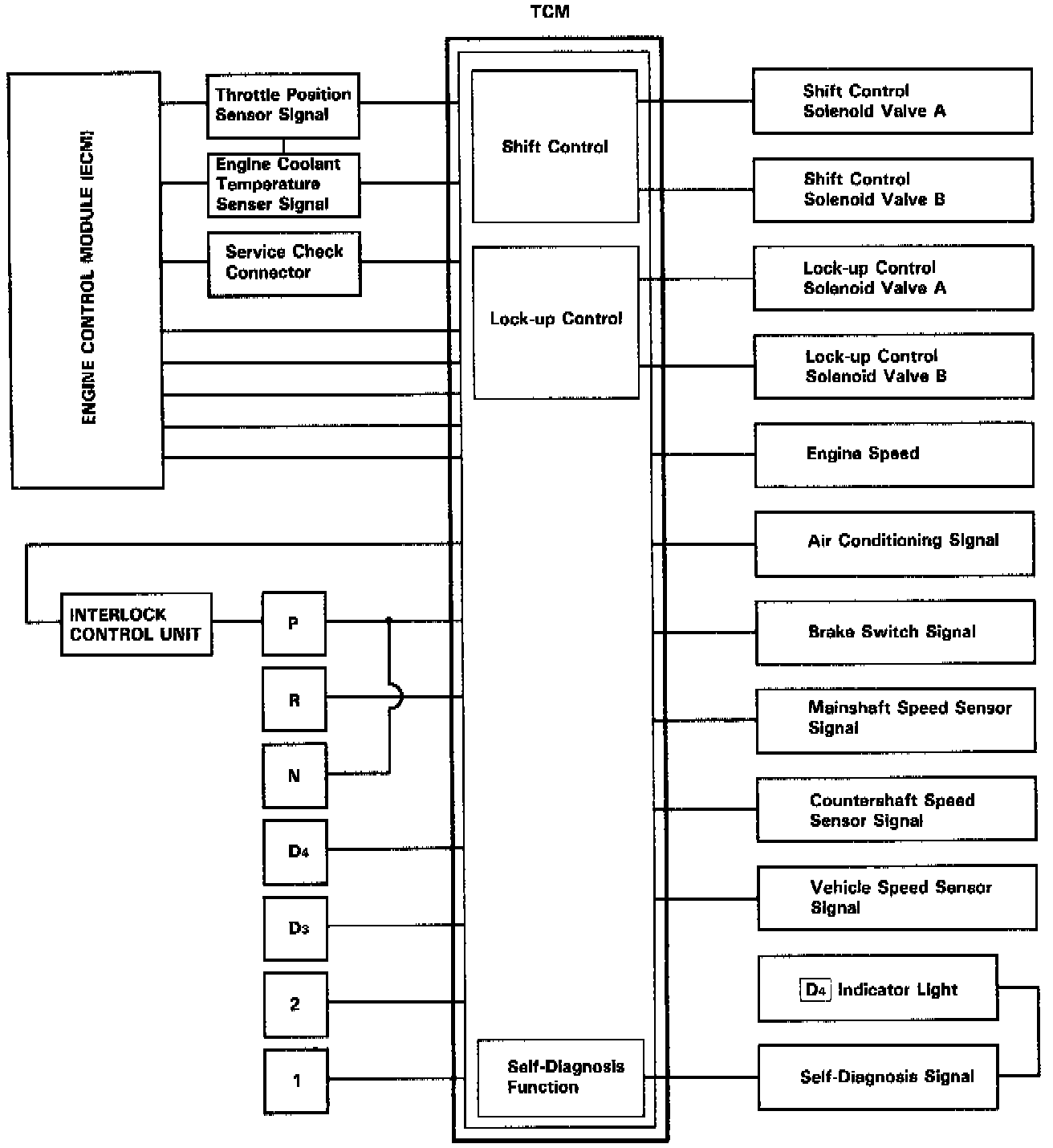 The electronic control system consists of the Transmission Control Module (TCM), sensors, and four solenoid valves. Shifting and lock-up are electronically controlled for comfortable driving under all conditions.