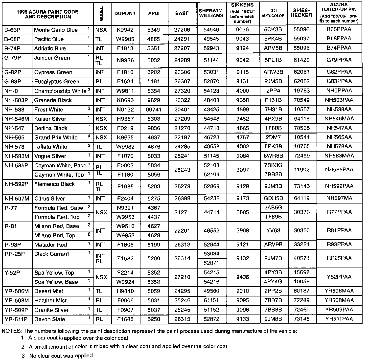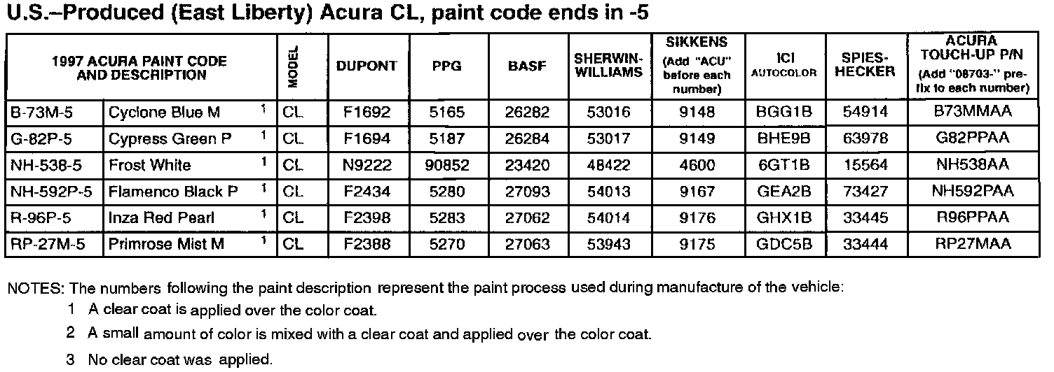 1997 Acura Paint Codes