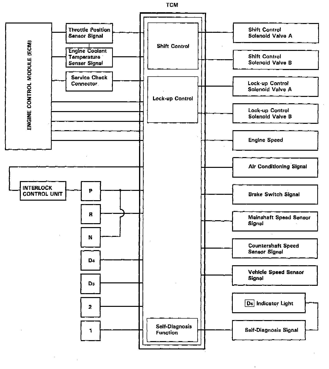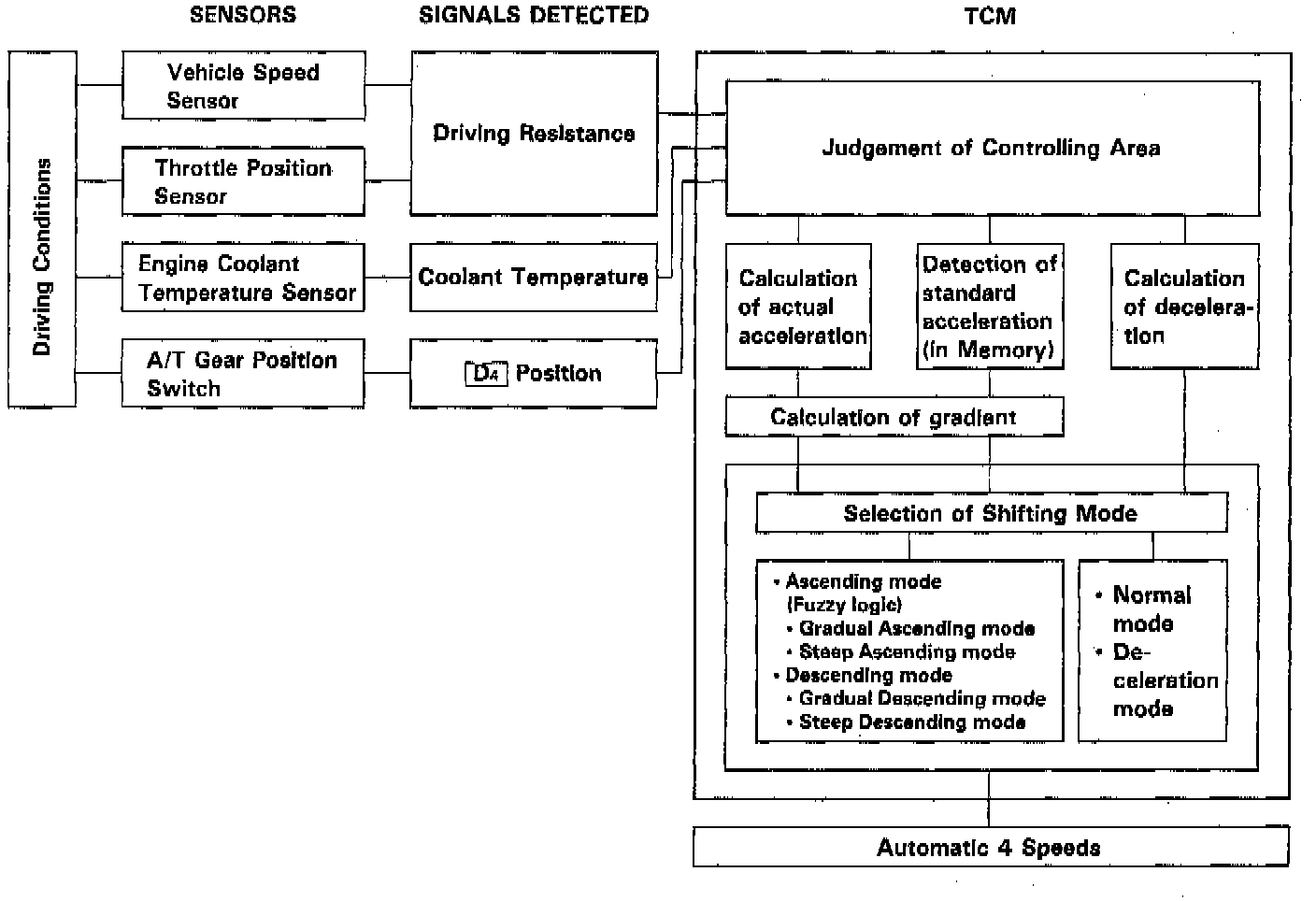 The TCM instantaneously determines which gear should be selected by various signals sent from sensors, and actuates the shift control solenoid valves A and B control shifting. Also, a Grade Logic Control System has been adopted to control shifting in D4 position while the vehicle is ascending or descending a slope, or reducing speed.