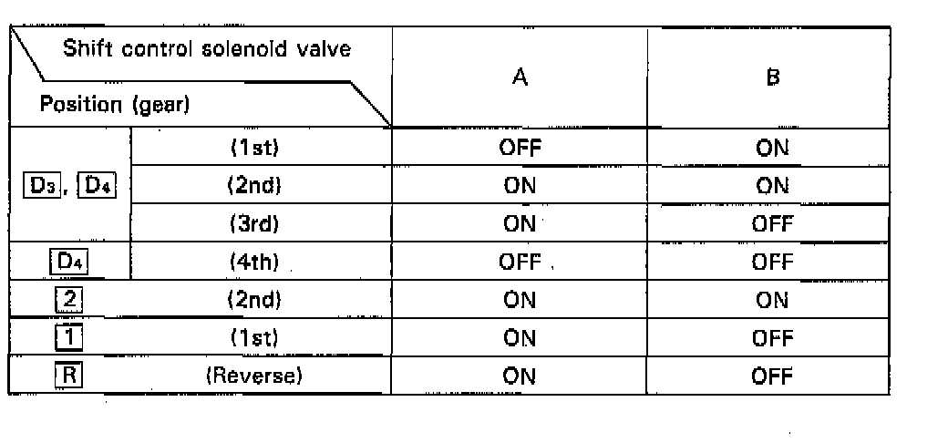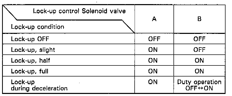 From sensor input signals, the TCM determines whether to turn the lock-up ON or OFF and activates lock-up control solenoid valve A and/or B accordingly. The combination of driving signals to lock-up control solenoid valves A and B is shown in the table.